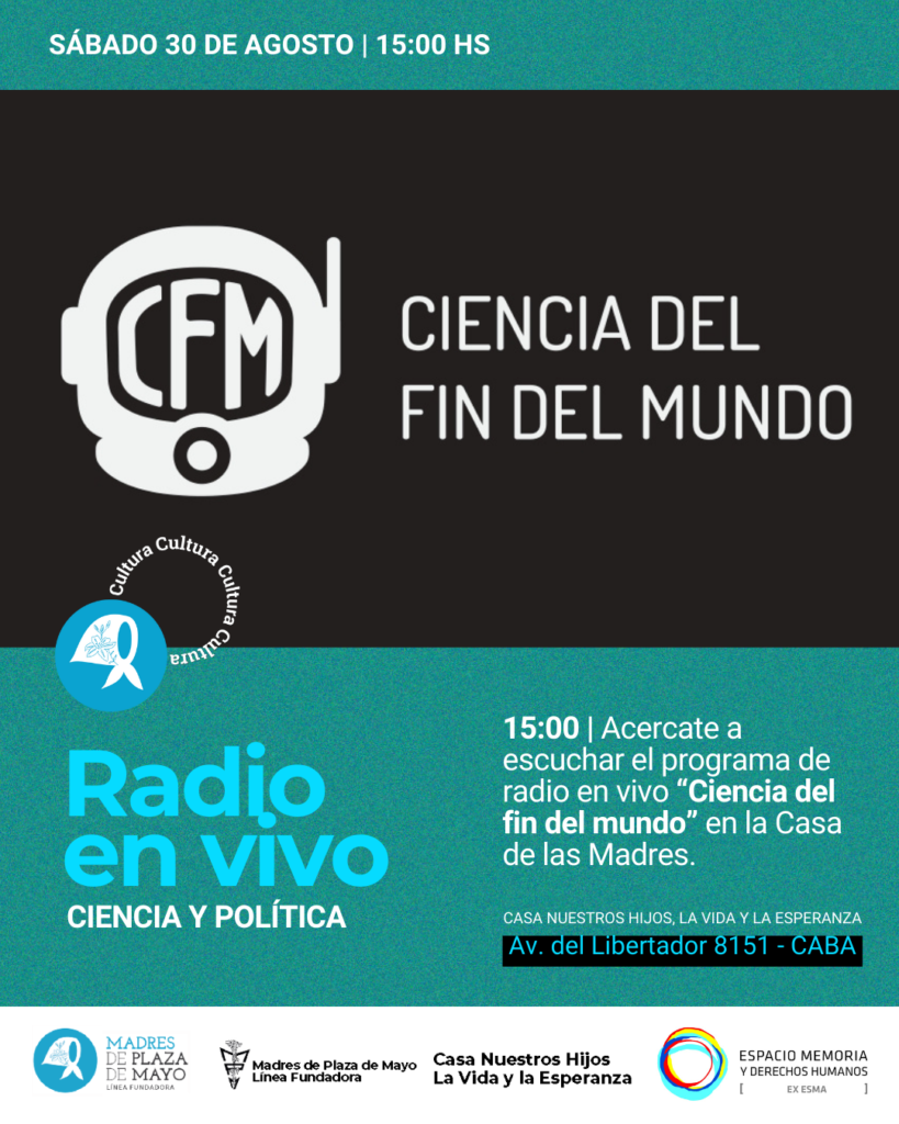 13 hs – Radio en Vivo: Transmisión en vivo del programa radial “Ciencia del fin del mundo” (@ciencia_fm). Acercate a participar del programa .