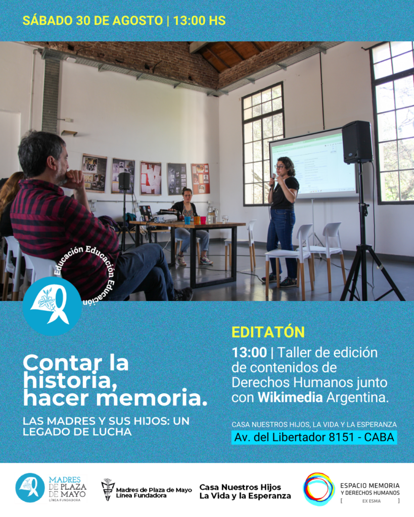 13 hs – Editatón «Contar la historia. Hacer memoria»: Taller de edición de contenidos de Derechos Humanos en la Wiki con el equipo de Wikimedia Argentina (@wikimedia_ar). Pensamos el uso de Wikimedia como una herramienta educativa y de construcción de memoria en espacios digitales. Vas a aprender a editar contenidos y cómo utilizar todas las herramientas de Wiki. Se entregarán certificados de asistencia.