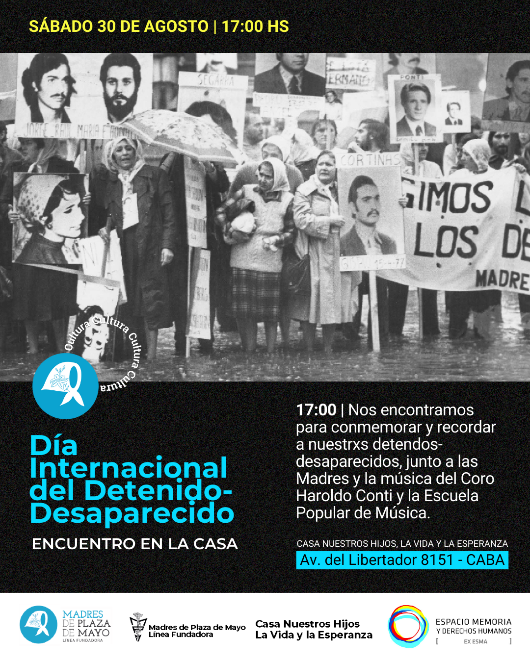 17 hs – Acto por el Día Internacional del Detenido Desaparecido: acto homenaje junto a las Madres y otros organismos de familiares. Nos encontramos para conmemorar y recordar a nuestrxs detenidxs-desaparecidxs, junto a las Madres y la música del Coro Haroldo Conti y la Escuela Popular de Música.