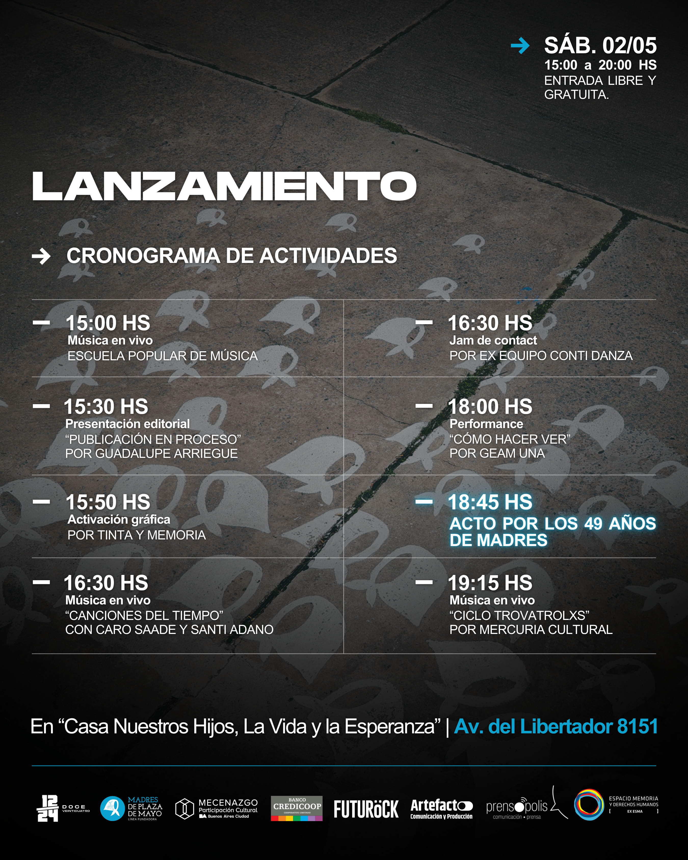 El lanzamiento de “El movimiento que insiste” contará con la presentación de la Escuela Popular de Música, la performance musical Canciones del Tiempo donde Vero Gerez, Caro Saade y Santi Adano interpretan un repertorio de María Elena Walsh; el grupo GEAM de la Universidad Nacional de las Artes presentará una obra en torno al disparo criminal que hirió a Pablo Grillo, dirigida por Jazmín Titiunik inscribiendo el presente en el campo de lo sensible; una Jam de danza coordinada por lxs ex-trabajadores del área de danza del Centro Cultural de la Memoria Haroldo Conti; el acto central por el 49 aniversario de la Primera Ronda de las Madres; y un cierre musical a cargo de la artista Tita Print, curado por Mercuria Cultural, con su ciclo Trovatrolxs, que abren el espacio a la circulación libre entre prácticas, generaciones y formas de presencia.